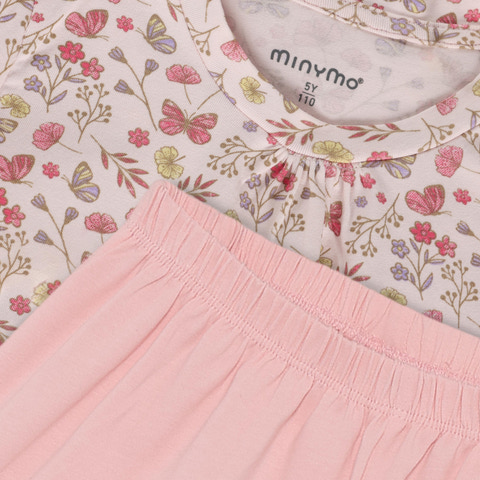 Denna fina set från Minymo, ”T-shirt och shorts set - Raindrops on Roses”, är det perfekta valet för varma sommardagar eller mysiga stunder hemma. Setet består av en kortärmad T-shirt med ett bedårande blommönster i rosa och gröna nyanser som utstrålar sommar och lätthet. T-shirten har en klassisk rund halsringning och en bekväm passform som ger god rörelsefrihet för lek och aktivitet. De matchande shortsen är enfärgade i en delikat rosa färg och har en mjuk elastisk midjeresår som garanterar en bekväm passform utan att sitta för tight. Materialet är lätt och andas, vilket gör setet perfekt både för vardagsbruk och som nattkläder under varma nätter. Med detta set får du både komfort och en söt, somrig look som ditt barn kommer att älska att ha på sig. Perfekt för lek, avkoppling och sömn – och lätt att tvätta och hålla snyggt.