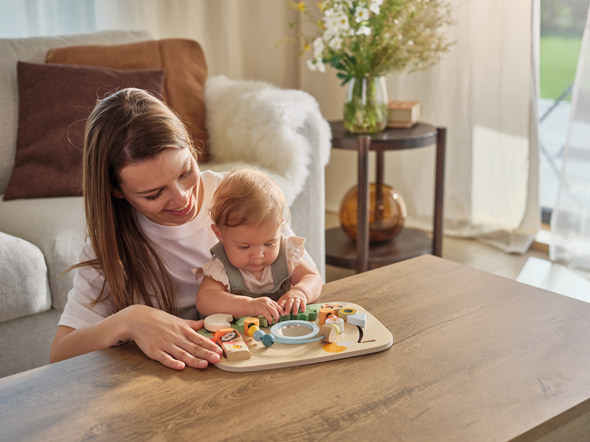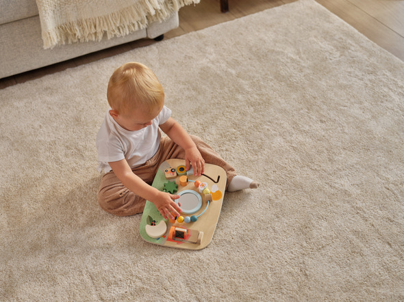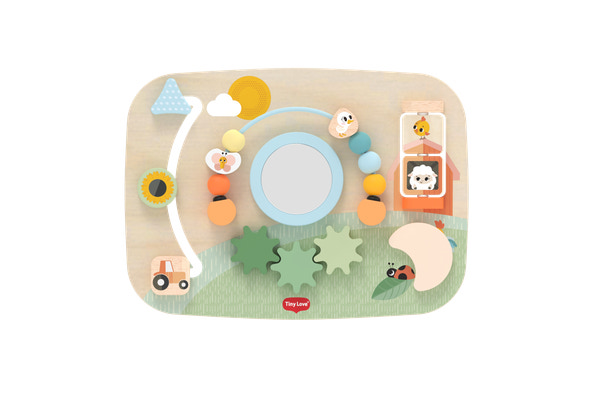 Farmers Funday Wooden Busy Board uppmuntrar små barn att utforska, lära sig och leka samtidigt. Brädet är tillverkat av trä från ansvarsfullt skötta skogar och utformat med en rad roliga, interaktiva aktiviteter som stimulerar barnets sinnen och utveckling. Med funktioner som ”track-&-trace”-skjutare, dubbelsidiga vridplattor, kugghjul, Peek-a-boo och mycket mer får barnet möjlighet att utveckla finmotorik, nyfikenhet och tidig logisk förståelse. Oavsett om den används för lek på magen, sittande lek eller senare i stående position, erbjuder busy boarden lek som växer med barnet och stöder utvecklingen i alla steg.