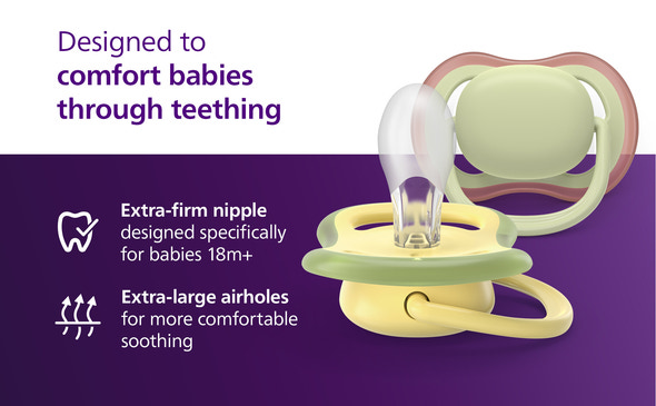 Som nybliven förälder är det viktigt att välja rätt napp till ditt barn. Nappen är avsedd för barn från 18 månader och uppåt och har fyra extra stora luft hål som låter huden andas och håller den torr och bekväm – en praktisk funktion när nappen används under längre perioder. Den symmetriska silikonsnutte följer den naturliga formen på gommen, tänderna och tandköttet, vilket ger komfort och trygghet. Den silkesmjuka silikonsnutte är utformad för att efterlikna en moders bröst. Designen är bekväm för barnet, och hela 98 %* av spädbarnen accepterar lätt sutten. Nappen är tillverkad av 100 % medicinsk silikon, är hållbar och fri från BPA. Den är superenkel att rengöra och tål höga temperaturer, så den kan steriliseras effektivt.