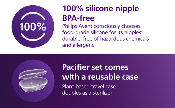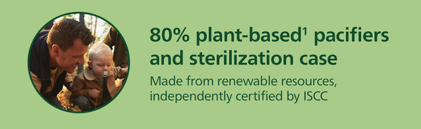 Det medföljande fodralet fungerar både som förvaring och sterilisator. Tillsätt bara lite vatten i fodralet så kan nappar steriliseras i mikrovågsugnen på bara 3 minuter – perfekt för upptagna föräldrar på språng! En ytterligare faktor är att produkten är miljövänlig tack vare att den till 80 % består av växtbaserade material*, som är skonsamma mot planeten och ger denna fantastiska produkt en miljövänlig dimension.