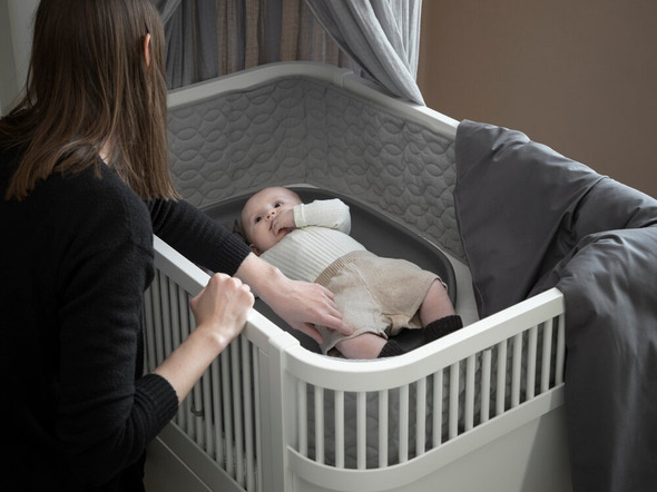 I denna nya modell kan sängbotten höjas och sänkas. Det innebär en ergonomiskt riktig position för dig när du ska lyfta i och ur barnet. Du börjar med det högsta läget till nyfödd och när barnet kan sitta själv sänker du ner botten för att förhindra fallolyckor. Madrassen består av två delar, en baby-madrass och en extradel som används när sängen dras ut för att bli en juniorsäng. Madrassen är måttanpassad och har rundade hörn för att passa spjälsängen perfekt. Köp till tillbehör som fallskydd, sänglåda och spjälsskydd. Sängen från Sebra kan matchas med ett fint skötbord i samma design.