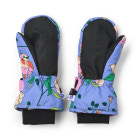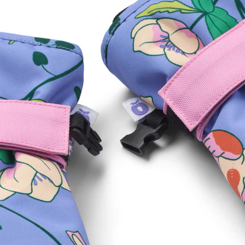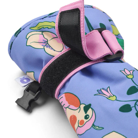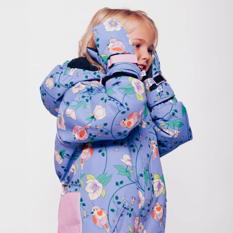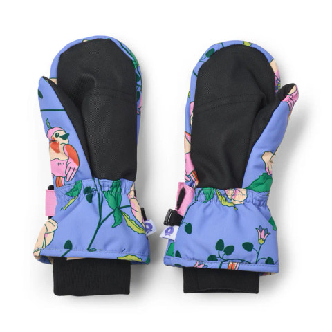 Vantar med fåglar och blommor. Dessa vantar har ett justerbart kardborreband vid handleden och kan fästas ihop med ett spänne. Handskarna har en slitstark beläggning på handflatan och ribbning vid handlederna för att förhindra att kall vind och snö tränger in.