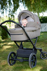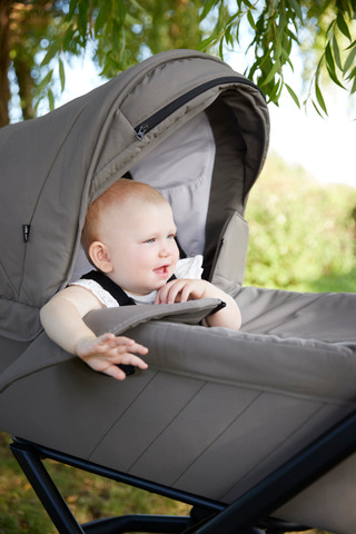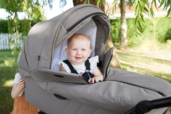 • Centrerade monteringsfästen gör det enkelt att fästa och ta bort barnvagnens liggdel.