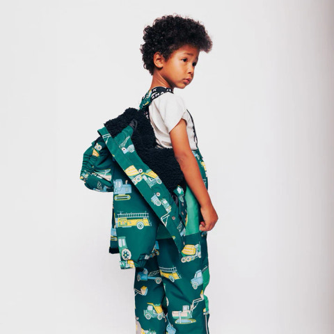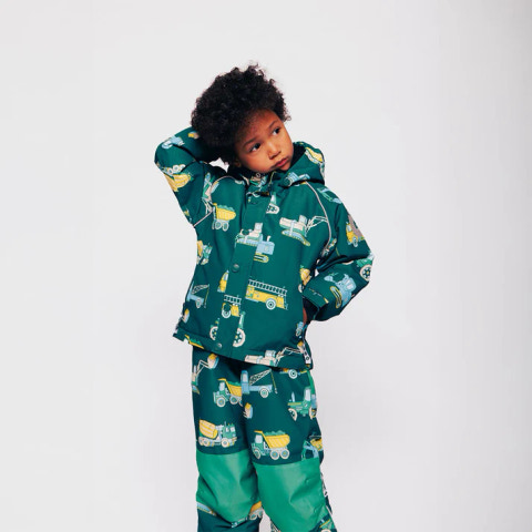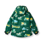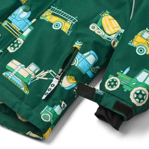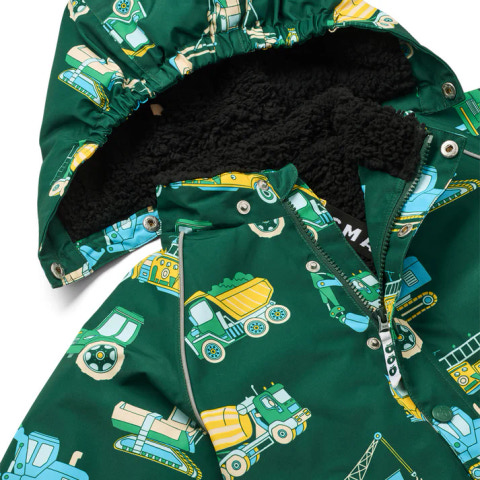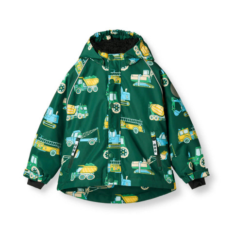 Vinterjacka med fordon. Jackan har dragkedja fram och en avtagbar huva med teddyfleece. Jackan har hängslen och en justerbar vindskyddskrage längst ner, samt vindskydd och kardborreknäppning vid ärmsluten som också kan justeras. Vinterjackan har reflekterande piping på ärmarna.