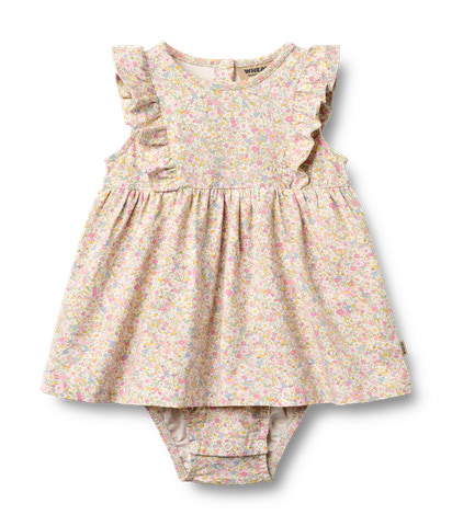 Wheats bodysuitklänning är både söt och bekväm att ha på sig och röra sig i. Bodysuitklänningen är praktisk, eftersom den är en kombination av en löst sittande klänning med en klassisk bodysuit under. Den har knäppning bak för att göra det lättare för dig att klä på ditt barn. Bodysuit-klänningen har tryckknappar i nederkanten, vilket gör det enkelt att komma åt barnets blöja. Den är lätt att matcha med ett par av våra sandaler för att komplettera den söta sommarlooken, eller så kan du lägga till leggings och en stickad tröja på kallare dagar.
