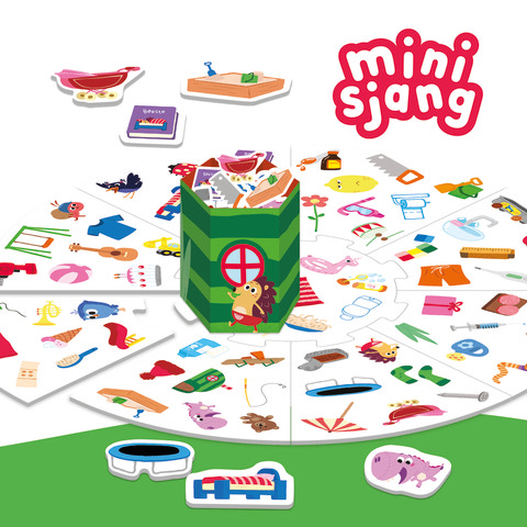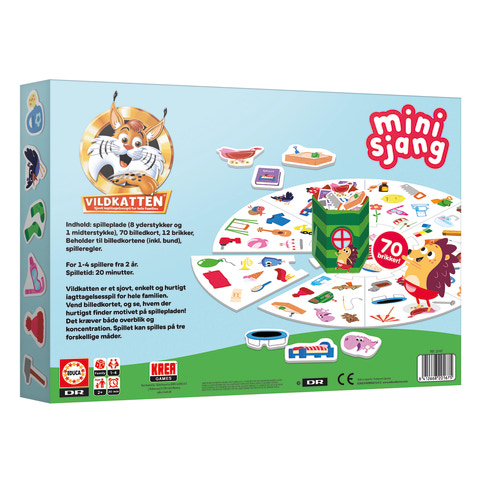 Vildkatten Minisjang Børste är ett roligt och pedagogiskt spel som fokuserar på både lek och språkutveckling. Bitarna är indelade i 12 kategorier, så att du kan träna ditt barns förmåga att sätta ord i sitt sammanhang. Kategorierna är: Kläder, leksaker, verktyg, läggdags, hos läkaren, på stranden, mat, på dagis, på lekplatsen, musikinstrument, i trädgården och födelsedag. Språkutvecklingen tränas också genom lek – och medan du leker. Fyra enkla tips kan hjälpa till att stärka ditt barns ordförråd och konversationsförmåga: ”Sätt ord på det du ser”, ”Ställ nyfikna frågor”, ”Utvidga ämnet” och ”Koppla orden till vardagen”. Spelet gör det enkelt och roligt att lära sig genom dialog och delade upplevelser.