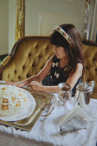 Klänningen har ett mjukt bomullsfoder och en vid kjol. Knäpps bak i nacken med en enda pärlemorknapp.